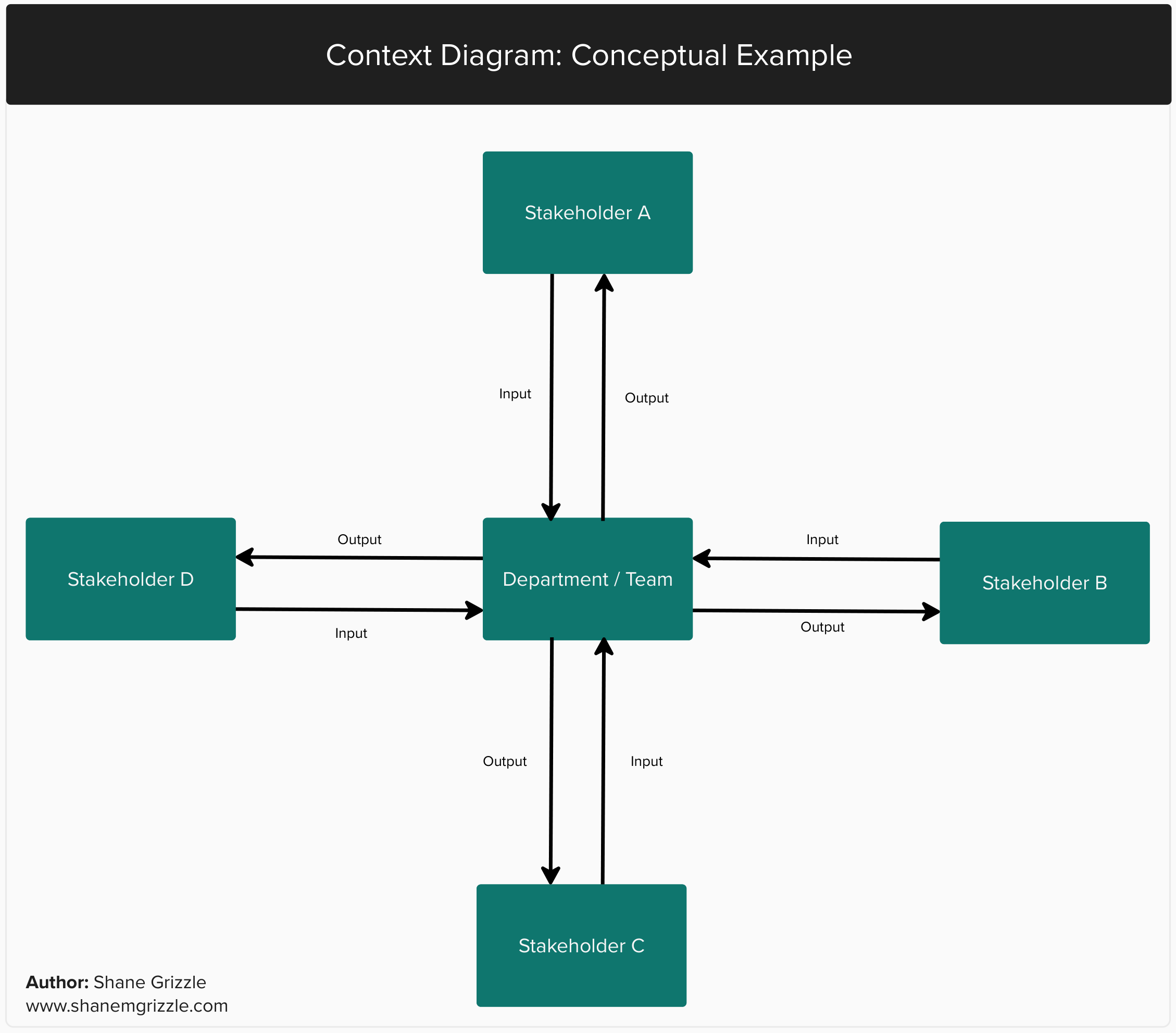 The context diagram is a simple tool that leaders can leverage to unpack the complexities of stakeholder relationships. The benefits are straightforward, as context diagrams provide a visual snapshot that helps facilitate a comprehensive understanding of relationships and high-level deliverables. The simplicity of a context diagram makes it an excellent resource for onboarding new team members and assisting other areas to understand the stakeholder relationships that exist for a given “system.” Therefore, it’s a tool that helps builds bridges within an organization.